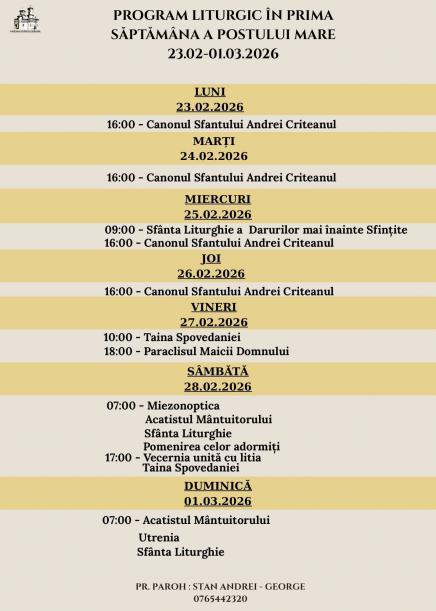 Evenimente Februarie 22, 2026 Citește alte articole despre: Program liturgic în prima săptămână a postului mare